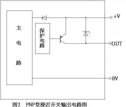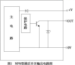 NPN 集电极开路输出电路的输出 OUT 端通过开关管和 0V 连接, 当传感器动作时,开关管饱和导通,OUT 端和 0V 相通,输出 0V 低 电平信号;PNP 集电极开路输出