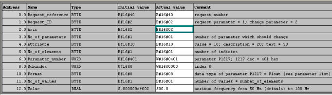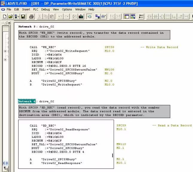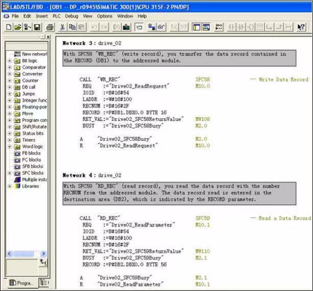 PLC 写参数时只需使用 S FC58,在本项目的 Network 3 中发送写请求 DB1 (参见图 7) 到驱动器; PLC 读