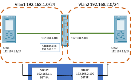 这种通讯架构的典型使用方式可参考图3的示意。两台PLC分属于不同网段,中间由一台支持NAT功能的设备互联,如SCALANCE S615,NAT设备将网段2的地址转换为网段1的一个地址,在通讯时,网段1的设备去访问转换后的地址即可实现两个设备的通讯。