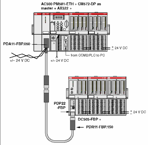 本例中:我们介绍非常普遍的Profibus DP 分布式扩展方式。在进行分布式扩展时,需要增加一个分布式扩展模块:DC505-FBP (Profibus DP 从站) 每增加一个从站就需要添加一个分布式扩展模块。每个分布式模块的带模块能力:开关量模块 Max:7 块 ;模拟量模块 Max:32 路输入 32 路输出 ,总共不能超过 64 路。通讯距离和带从站的数量由所选择的总线决定。如:Profibus DP ,不带中继器 32 个从站,通讯距离为 1200 米。